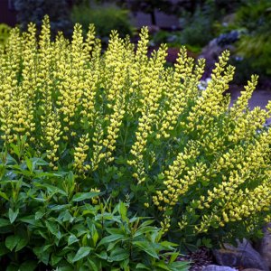 Roślina produkuje mnóstwo złocistożółtych kwiatostanów